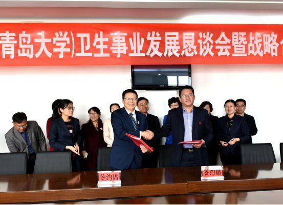 11月3日,医学部与蓬莱市卫生和计划生育局在蓬莱市人民医院会议室举行战略合作签约仪式。医学部常务副书记任洪彦、医学部常务副主任、青岛大学附属医院院长董蒨、医学部学工办主任于文洁、青岛大学医疗集团业务部主任张欣、蓬莱市政府党组成员魏玉敏、蓬莱市卫生和计划生育局局长张红松、副局长马慧妍、秦焕玉、蓬莱市人民医院院长姜宏伟、蓬莱市中医医院院长浦声波等出席签约仪式。